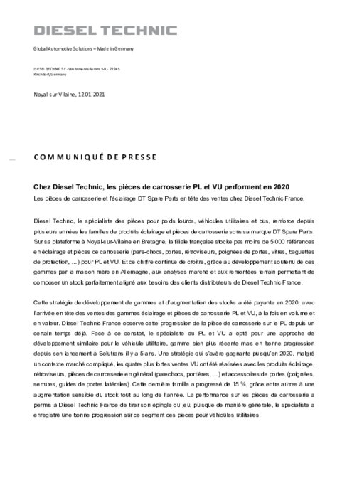 Diesel Technic, le spécialiste des pièces pour poids lourds, véhicules utilitaires et bus, renforce depuis plusieurs années les familles de produits éclairage et pièces de carrosserie sous sa marque DT Spare Parts. Sur sa plateforme à Noyal-sur-Vilaine en Bretagne, la filiale française stocke pas moins de 5 000 références en éclairage et pièces de carrosserie (pare-chocs, portes, rétroviseurs, poignées de portes, vitres, baguettes de protection, ...) pour PL et VU...
