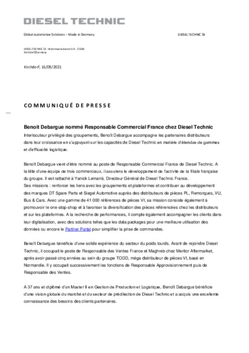 Benoît Debargue vient d'être nommé au poste de Responsable Commercial France de Diesel Technic. A la tête d'une équipe de trois commerciaux, il assurera le développement de l'activité de la filiale française du groupe. Il est rattaché à Yanick Lemarié, Directeur Général de Diesel Technic France.