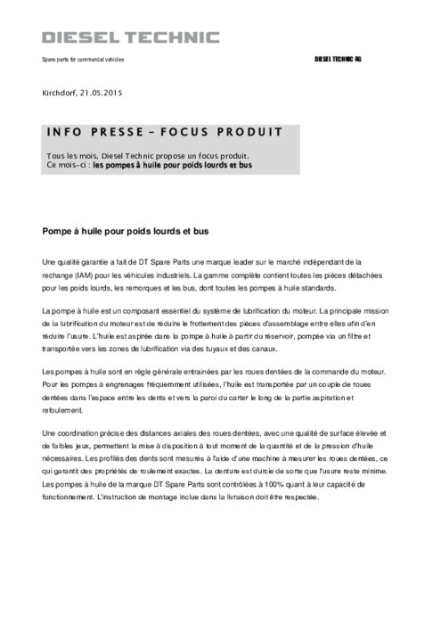 Une qualité garantie a fait de DT Spare Parts une marque leader sur le marché indépendant de la rechange (IAM) pour les véhicules industriels. La gamme complète contient toutes les pièces détachées pour les poids lourds, les remorques et les bus, dont toutes les pompes à huile standards. La pompe à huile est un composant essentiel du système de lubrification du moteur.