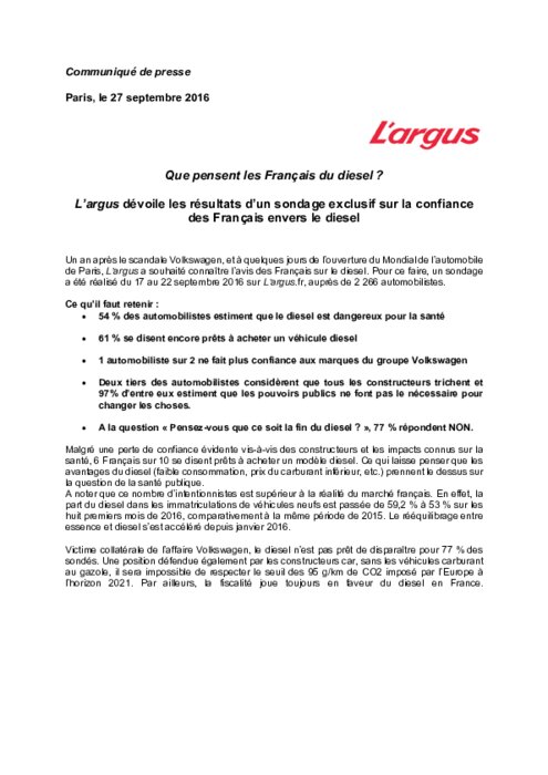 Un paradoxe que l'Argus explique en estimant que "les avantages du diesel (faible consommation, prix du carburant inférieur, etc.) prennent le dessus sur la question de la santé publique".