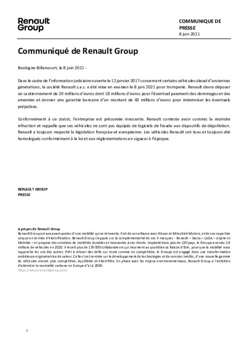 Renault devra déposer un cautionnement de 20 millions d'euros, dont 18 millions d'euros pour l'éventuel paiement des dommages et des amendes, et donner une garantie bancaire d'un montant de 60 millions d'euros pour indemniser les éventuels préjudices, a précisé le constructeur dans un communiqué.