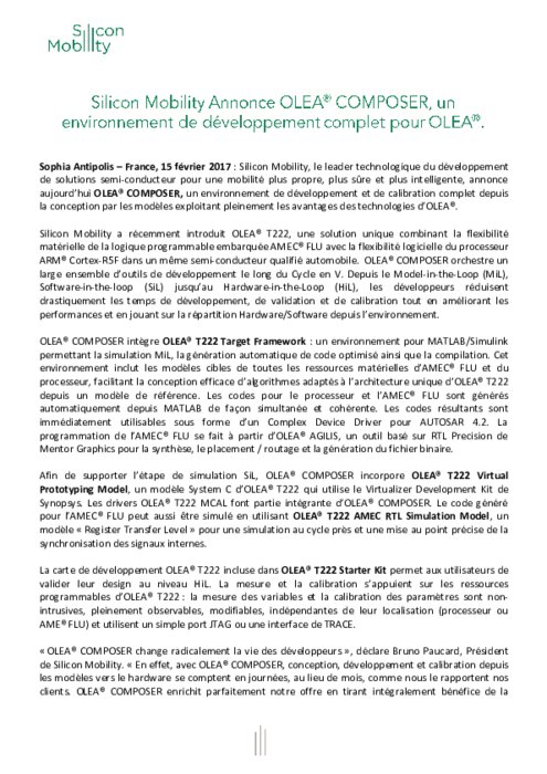 " OLEA COMPOSER change radicalement la vie des développeurs ", déclare Bruno Paucard, Président de Silicon Mobility. " En effet, avec OLEA COMPOSER ", conception, développement et calibration depuis les modèles vers le hardware se comptent en journées, au lieu de mois, comme nous le rapportent nos clients. OLEA COMPOSER enrichit parfaitement notre offre en tirant intégralement bénéfice de la singularité de nos solutions et bibliothèques logicielles...
