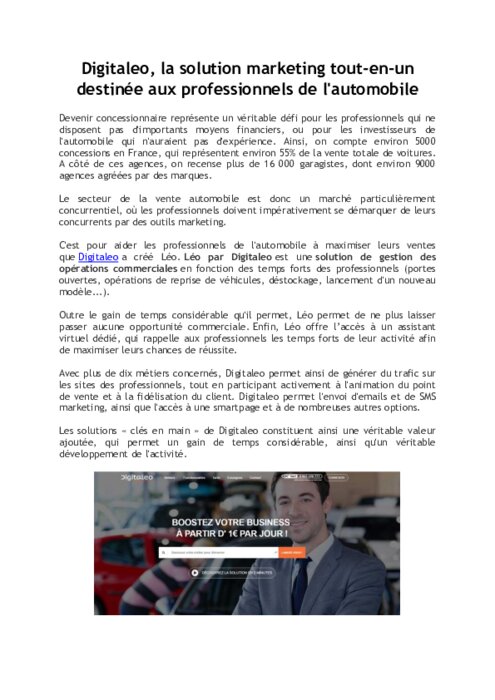 C'est pour aider les professionnels de l'automobile à maximiser leurs ventes que Digitaleo a créé Léo. Léo par Digitaleo est une solution de gestion des opérations commerciales en fonction des temps forts des professionnels (portes ouvertes, opérations de reprise de véhicules, déstockage, lancement d'un nouveau modèle...).
