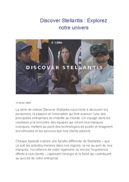 Constructeurs 13 février 2026 - 14:12 Rejoignez Stellantis pour un voyage au cœur de notre département Design, où les collaborateurs présents sur plusieurs continents imaginent la mobilité de demain avec créativité, ingéniosité et un style inimitable. PDF (2 Mo) Télécharger credit Stellantis