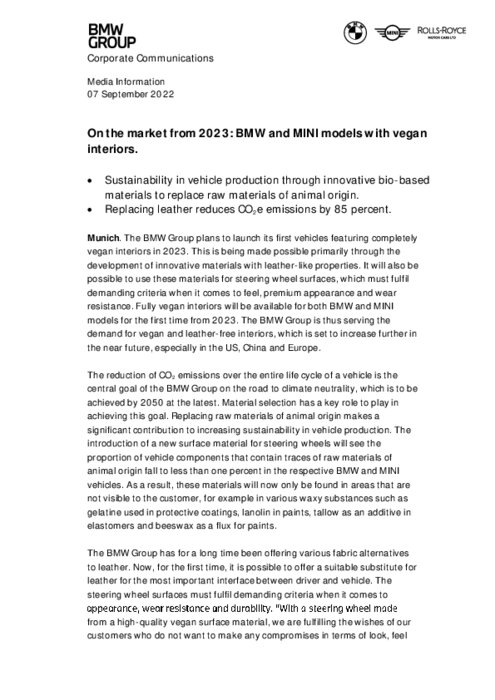 Un pas de plus vers la durabilité dans la production de véhicules grâce aux matériaux biosourcés innovants pour remplacer les matières premières d'origine animale. Le remplacement du cuir d'origine animal va permettre de réduire les émissions de CO2 de 85 %. Le groupe BMW prévoit de lancer ses premiers véhicules dotés d'intérieurs entièrement végétalisés en 2023. Cela est rendu possible principalement par le développement de matériaux innovants ayant des propriétés similaires à celles du cuir.