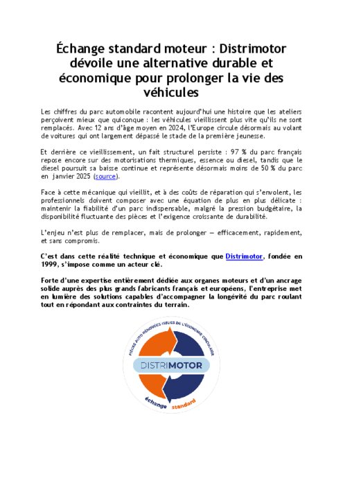 Distrimotor, distributeur pure player fondé en 1999, propose aux professionnels une alternative concrète et durable au remplacement à neuf : des moteurs, boîtes de vitesses et organes mécaniques reconditionnés selon les standards constructeurs, disponibles en ligne, livrés en 24 à 48 h.