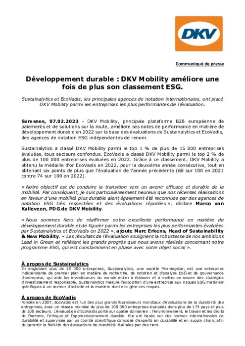 DKV Mobility, principale plateforme B2B européenne de paiements et de solutions sur la route, améliore ses notes de performance en matière de développement durable en 2022 sur la base des évaluations de Sustainalytics et EcoVadis, des agences de notation ESG indépendantes de renom.