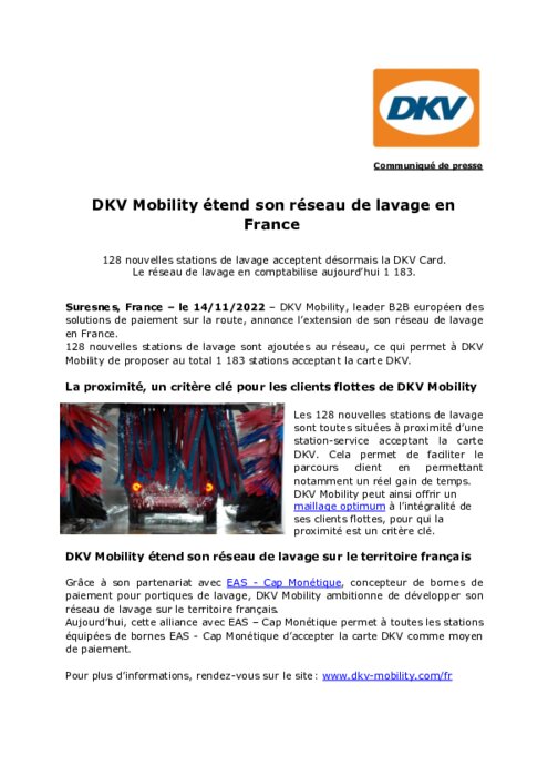 DKV Mobility, leader B2B européen des solutions de paiement sur la route, annonce l’extension de son réseau de lavage en France. 128 nouvelles stations de lavage sont ajoutées au réseau, ce qui permet à DKV Mobility de proposer au total 1 183 stations acceptant la carte DKV.