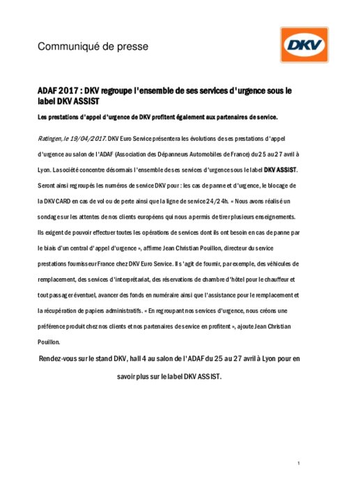 DKV Euro Service présentera les évolutions de ses prestations d'appel d'urgence au salon de l'ADAF (Association des Dépanneurs Automobiles de France) du 25 au 27 avril à Lyon. La société concentre désormais l'ensemble de ses services d'urgence sous le label DKV ASSIST. Seront ainsi regroupés les numéros de service DKV pour : les cas de panne et d'urgence, le blocage de la DKV CARD en cas de vol ou de perte ainsi que la ligne de service 24/24h.