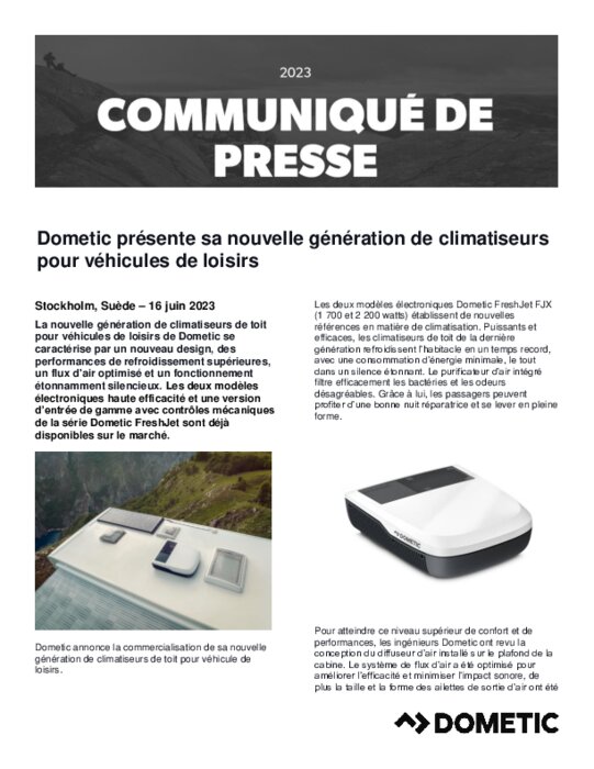 La nouvelle génération de climatiseurs de toit pour véhicules de loisirs de Dometic se caractérise par un nouveau design, des performances de refroidissement supérieures, un flux d'air optimisé et un fonctionnement étonnamment silencieux. Les deux modèles électroniques haute efficacité et une version d’entrée de gamme avec contrôles mécaniques de la série Dometic FreshJet sont déjà disponibles sur le marché.