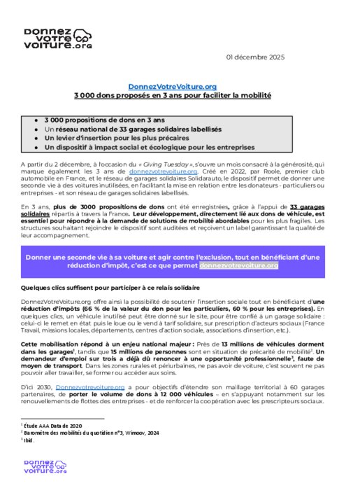 A partir du 2 décembre, à l'occasion du « Giving Tuesday », s’ouvre un mois consacré à la générosité, qui marque également les 3 ans de donnezvotrevoiture.org. Créé en 2022, par Roole, premier club automobile en France, et le réseau de garages solidaires Solidarauto, le dispositif permet de donner une seconde vie à des voitures inutilisées, en facilitant la mise en relation entre les donateurs - particuliers ou entreprises - et son réseau de garages solidaires labellisés.