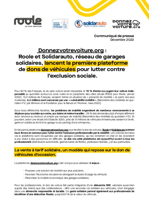 Donnezvotrevoiture.org : Roole et Solidarauto, lancent une plateforme de dons de véhicules pour lutter contre l’exclusion sociale