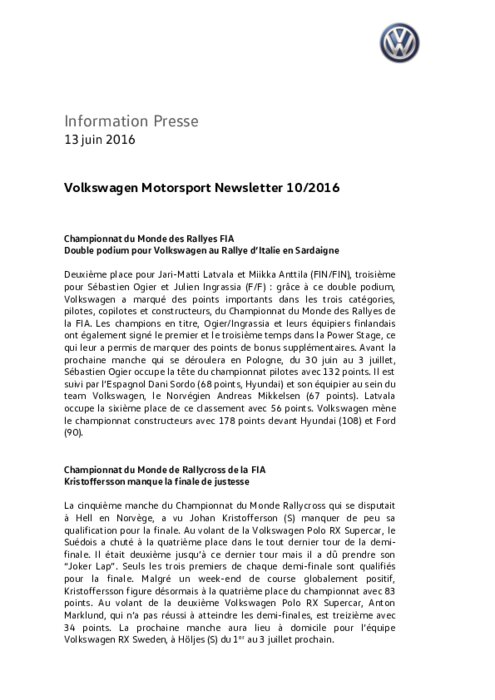 Deuxième place pour Jari-Matti Latvala et Miikka Anttila (FIN/FIN), troisième pour Sébastien Ogier et Julien Ingrassia (F/F) : grâce à ce double podium, Volkswagen a marqué des points importants dans les trois catégories, pilotes, copilotes et constructeurs, du Championnat du Monde des Rallyes de la FIA. Les champions en titre, Ogier/Ingrassia et leurs équipiers finlandais ont également signé le premier et le troisième temps dans la Power Stage.
