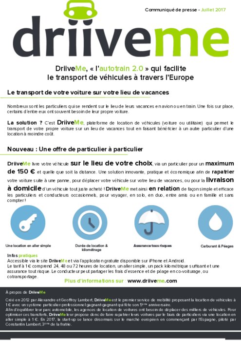 Nombreux sont les particuliers qui se rendent sur leur lieu de vacances en avion ou en train mais une fois sur place, certains d’entre eux ont souvent besoin de leur propre voiture. La solution ? C’est DriiveMe, plateforme de location de véhicules (voiture ou utilitaire) qui permet le transport de votre propre voiture sur un lieu de vacances tout en faisant bénéficier à un autre particulier d’une location à moindre coût.