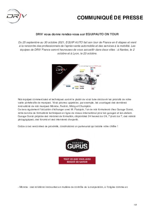 Du 25 septembre au 30 octobre 2021, EQUIP AUTO fait son tour de France en 6 étapes et vient à la rencontre des professionnels de l'après-vente automobile et des services à la mobilité. Les équipes de DRiV France seront heureuses de vous accueillir dans deux villes : à Nantes, le 2 octobre et à Lyon, le 23 octobre.