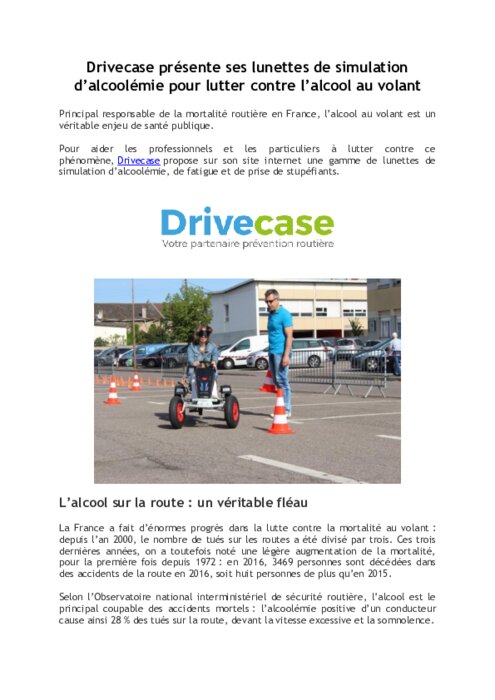 Principal responsable de la mortalité routière en France, l’alcool au volant est un véritable enjeu de santé publique. Pour aider les professionnels et les particuliers à lutter contre ce phénomène, Drivecase propose sur son site internet une gamme de lunettes de simulation d’alcoolémie, de fatigue et de prise de stupéfiants.