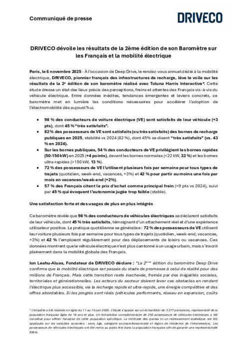 À l’occasion de Deep Drive, le rendez-vous annuel dédié à la mobilité électrique, DRIVECO, pionnier français des infrastructures de recharge, lève le voile sur les résultats de la 2ᵉédition de son baromètre réalisé avec Toluna Harris Interactive.Cette étude dresse un état des lieux précis des perceptions, freins et attentes des Français vis-à-vis du véhicule électrique. Entre données inédites, tendances émergentes et leviers concrets, ce baromètre met en lumière les conditions nécessaires pour accélérer l’adoption de l’électromobilité dès aujourd’hui.