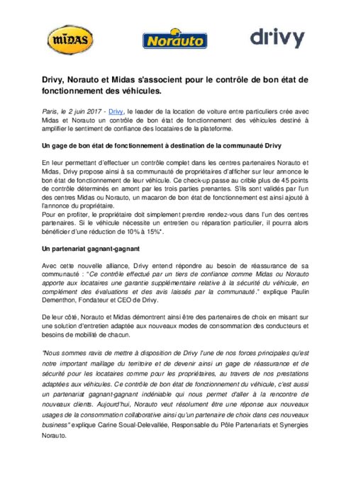Drivy, le leader de la location de voiture entre particuliers crée un certificat qualité pour tous les véhicules de la plateforme ayant validé un contrôle complet dans l’un des centres Midas ou Norauto.