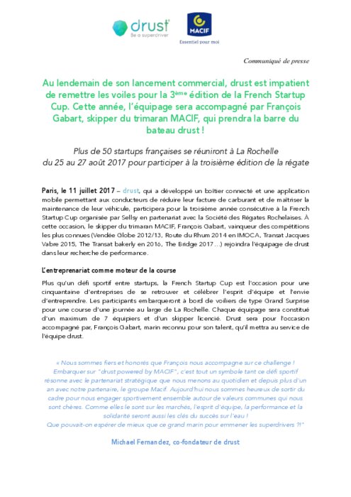 Au lendemain de son lancement commercial, drust est impatient de remettre les voiles pour la 3ème édition de la French Startup Cup. Cette année, l’équipage sera accompagné par François Gabart, skipper du trimaran MACIF, qui prendra la barre du bateau drust !