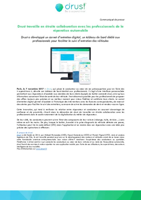 drust, qui place le conducteur au cœur de ses préoccupations pour en faire des "superdrivers", dévoile son tableau de bord destiné aux professionnels. Il s'agit d'une interface personnalisée permettant aux réparateurs d'accéder aux données de leurs clients équipés du boitier connecté drust, ainsi qu'aux informations concernant l'état de santé de leur véhicule. Il est désormais possible pour les professionnels de proposer des offres toujours plus précises et au meilleur moment...