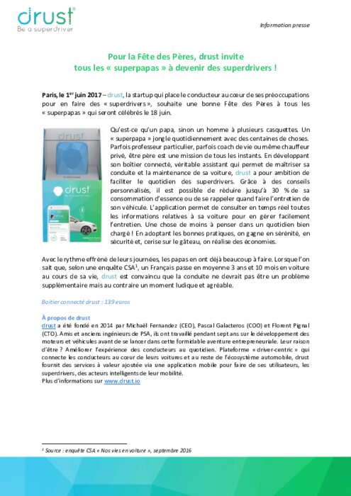 Services 01 juin 2017 - 14:52 drust, la startup qui place le conducteur au cœur de ses préoccupations pour en faire des " superdrivers ", souhaite une bonne Fête des Pères à tous les " superpapas " qui seront célébrés le 18 juin. PDF (335 Ko) Télécharger