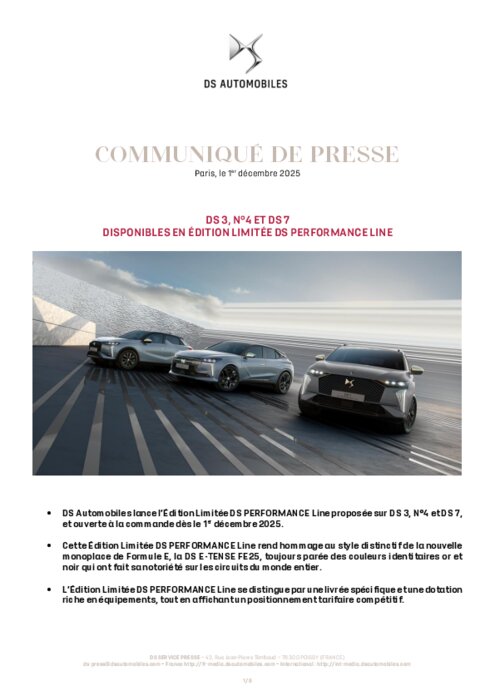 Constructeurs 02 décembre 2025 - 12:44 Depuis 2015, DS Automobiles capitalise sur son engagement en Formule E pour affiner son expertise technologique. Ce savoir-faire se reflète aujourd’hui dans cette nouvelle Édition Limitée DS PERFORMANCE Line. PDF (249 Ko) Télécharger credit DS
