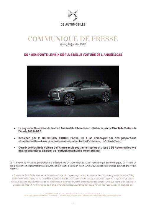 Constructeurs 25 janvier 2022 - 10:52 DS 4 incarne la nouvelle génération de créations de DS Automobiles. Aussi raffinée que technologique, DS 4 allie un design extérieur charismatique à la pureté et la fluidité du design intérieur marquées par de multiples confections « fait-main ». PDF (186 Ko) Télécharger