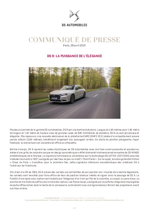 Placée au sommet de la gamme DS Automobiles, DS 9 est une berline statutaire. Longue de 4,93 mètres pour 1,93 mètre de largeur et 1,46 mètre de hauteur avec de grandes roues de 690 millimètres de diamètre, DS 9 se veut dynamique et élégante. Elle repose sur une nouvelle déclinaison de la plateforme EMP2 (EMP2 V2.3) dotée d’un empattement encore jamais atteint (2,90 mètres), bénéficiant largement aux passagers arrière...
