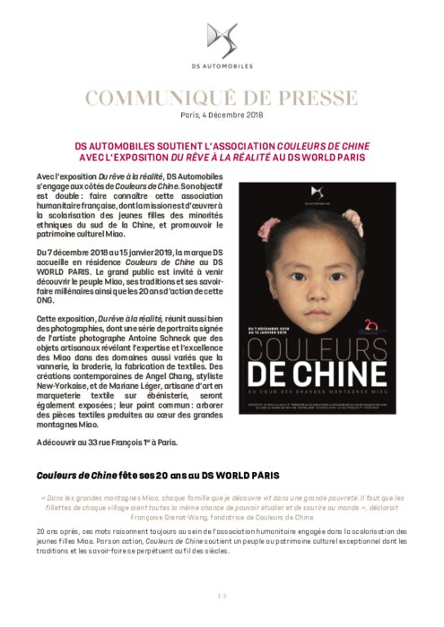 Du 7 décembre 2018 au 15 janvier 2019, la marque DS accueille en résidence Couleurs de Chine au DS WORLD PARIS. Le grand public est invité à venir découvrir le peuple Miao, ses traditions et ses savoir-faire millénaires ainsi que les 20 ans d’action de cette ONG. Cette exposition, Du rêve à la réalité, réunit aussi bien des photographies, dont une série de portraits signée de l’artiste photographe Antoine Schneck que des objets artisanaux révélant l’expertise et l’excellence des Miao...