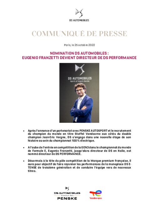 Après l’annonce d’un partenariat avec PENSKE AUTOSPORT et le recrutement du champion du monde en titre Stoffel Vandoorne aux côtés du double champion Jean-Eric Vergne, DS s’engage dans une nouvelle étape de son histoire au sein du championnat 100 % électrique. A l’aube de l’entrée en compétition de la GEN3 dans le championnat du monde de Formule E, Eugenio Franzetti, jusqu’alors directeur de DS en Italie, est nommé directeur de DS PERFORMANCE.