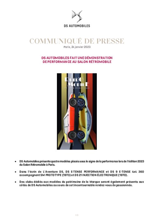 Constructeurs 24 janvier 2023 - 10:15 DS Automobiles fait une démonstration de performance à l’occasion de l’édition 2023 du Salon Rétromobile, organisé à Paris. Quatre modèles sont exposés, deux laboratoires technologiques et deux modèles de série qui incarnent tous la performance. PDF (172 Ko) Télécharger