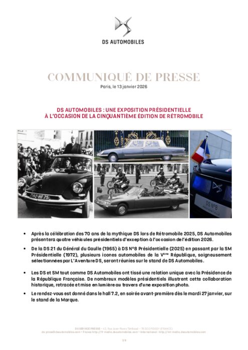 La 50e édition du salon Rétromobile se tiendra à Paris, Porte de Versailles, du 28 janvier au 1er février. Après avoir célébré en 2025 le 70èmeanniversaire de la mythique DS au travers d’une exposition exceptionnelle, DS Automobiles renouvelle sa présence à Rétromobile 2026 avec un stand entièrement inédit, déployé sur une surface de 250 m².
