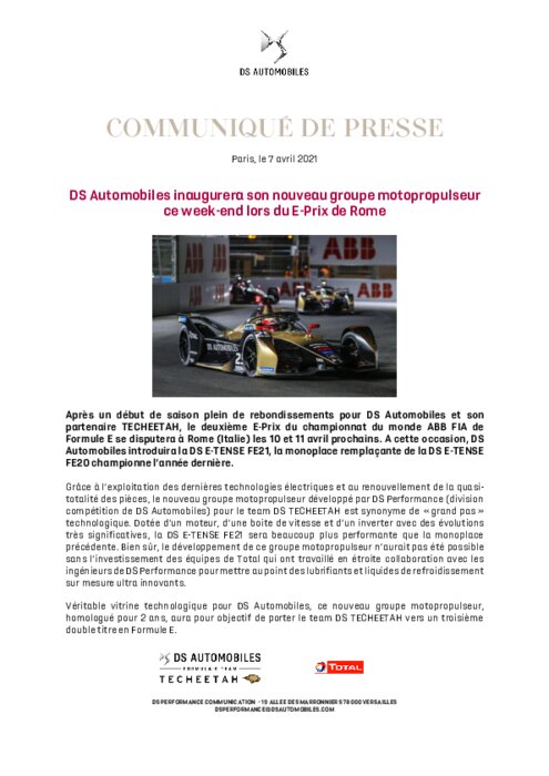 Après un début de saison plein de rebondissements pour DS Automobiles et son partenaire TECHEETAH, le deuxième E-Prix du championnat du monde ABB FIA de Formule E se disputera à Rome (Italie) les 10 et 11 avril prochains. A cette occasion, DS Automobiles introduira la DS E-TENSE FE21, la monoplace remplaçante de la DS E-TENSE FE20 championne l’année dernière.