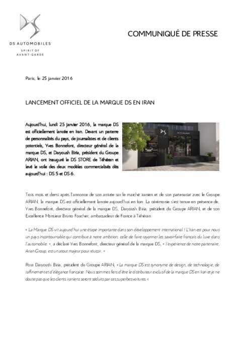 Lundi 25 janvier 2016, la marque DS est officiellement lancée en Iran. Devant un parterre de personnalités du pays, de journalistes et de clients potentiels, Yves Bonnefont, directeur général de la marque DS, et Daryoush Biria, président du Groupe ARIAN, ont inauguré le DS STORE de Téhéran et levé le voile des deux modèles commercialisés dès aujourd’hui : DS 5 et DS 6.