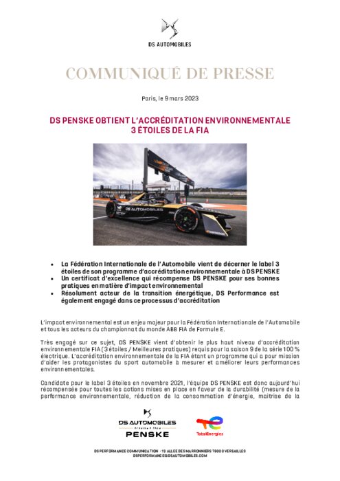 L’impact environnemental est un enjeu majeur pour la Fédération Internationale de l’Automobile et tous les acteurs du championnat du monde ABB FIA de Formule E. Très engagé sur ce sujet, DS PENSKE vient d’obtenir le plus haut niveau d’accréditation environnementale FIA (3 étoiles / Meilleures pratiques) requis pour la saison 9 de la série 100 % électrique.