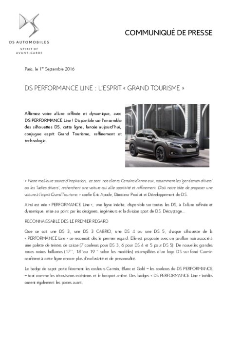 Constructeurs 01 septembre 2016 - 12:57 Affirmez son allure raffinée et dynamique, avec DS PERFORMANCE Line ! Disponible sur l’ensemble des silhouettes DS, cette ligne, lancée aujourd’hui, conjugue esprit Grand Tourisme, raffinement et technologie. PDF (133 Ko) Télécharger