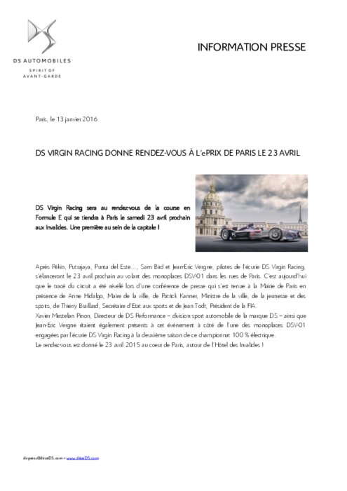 DS Virgin Racing sera au rendez-vous de la course en Formule E qui se tiendra à Paris le samedi 23 avril prochain aux Invalides. Une première au sein de la capitale !