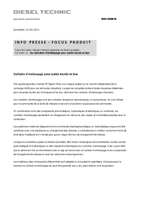 Une qualité garantie a fait de DT Spare Parts une marque leader sur le marché indépendant de la rechange (IAM) pour les véhicules industriels. La gamme complète contient toutes les pièces détachées pour les poids lourds, les remorques et les bus, dont tous les cylindres d’embrayage standards. Les cylindres d’embrayage sont des cylindres récepteurs pneumatiques ou hydrauliques. Ils sont utilisés pour la commande de la boîte de vitesses et servent à transférer la puissance de commande.