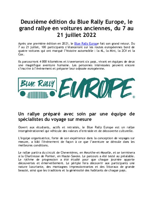 Après une première édition en 2021, le Blue Rally Europe fait son grand retour. Du 7 au 21 juillet, 100 participants s’élanceront sur les routes européennes bord de quatre voitures qui ont marqué l’histoire automobile : la 4L, la Mini, la 2CV et la Cox. Ils parcourront 4 000 kilomètres et traverseront six pays, vivant en équipes de deux une magnifique aventure humaine. Les personnes intéressées peuvent encore s’inscrire à l’évènement et préparer leur odyssée européenne.