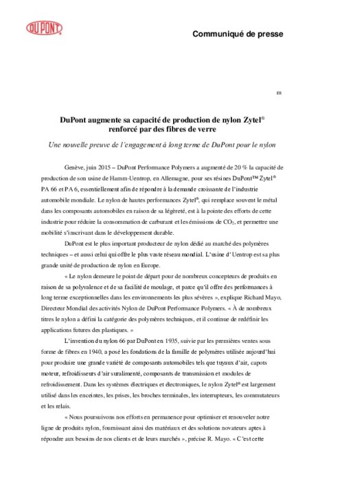 DuPont Performance Polymers a augmenté de 20 % la capacité de production de son usine de Hamm-Uentrop, en Allemagne, pour ses résines DuPont Zytel PA 66 et PA 6, essentiellement afin de répondre à la demande croissante de l’industrie automobile mondiale. Le nylon de hautes performances Zytel, qui remplace souvent le métal dans les composants automobiles en raison de sa légèreté, est à la pointe des efforts de cette industrie pour réduire la consommation de carburant et les émissions de CO2.