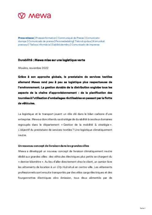 Grâce à son approche globale, le prestataire de services textiles allemand Mewa rend peu à peu sa logistique plus respectueuse de l’environnement. La gestion durable de la distribution englobe tous les aspects de la chaîne d’approvisionnement : de la planification des tournées à l’utilisation d’emballages réutilisables en passant par la flotte de véhicules