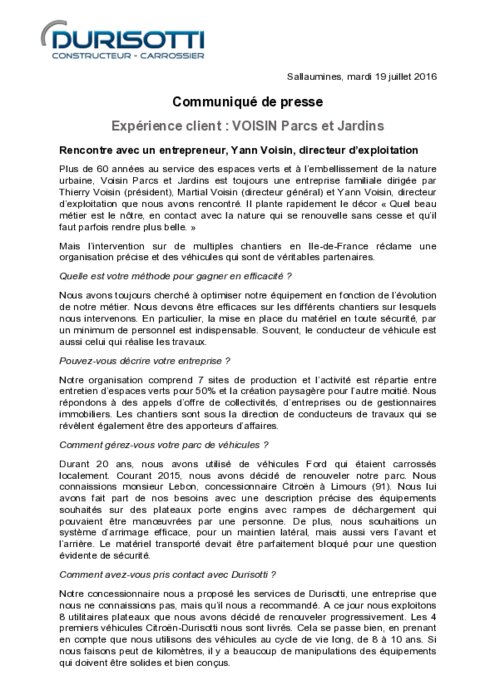 Durisotti occupe une place essentielle dans l'industrie de la carrosserie industrielle. En plus de transformations en série pour les administrations ou les grands comptes, Durisotti répond à des demandes d'entreprises dans les domaines les plus divers, entre autre, le domaine des parcs et jardins qui ont un besoin spécifique. Voici l'exemple de Voisin Parcs et Jardins, une entreprise familiale au service des espaces verts et à l'embellissement de la nature urbaine, qui a fait appel à Durisotti.