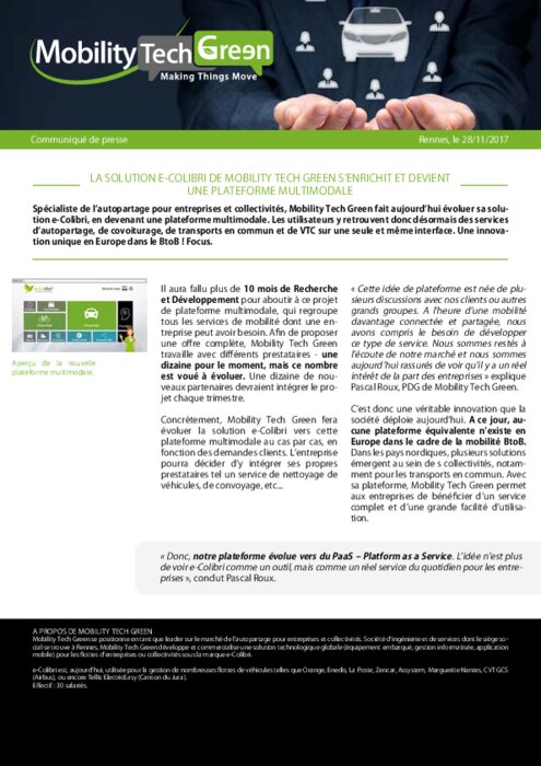 Spécialiste de l'autopartage pour entreprises et collectivités, Mobility Tech Green fait aujourd'hui évoluer sa solution e-Colibri, en devenant une plateforme multimodale. Les utilisateurs y retrouvent donc désormais des services d'autopartage, de covoiturage, de transports en commun et de VTC sur une seule et même interface. Une innovation unique en Europe dans le BtoB ! Focus.