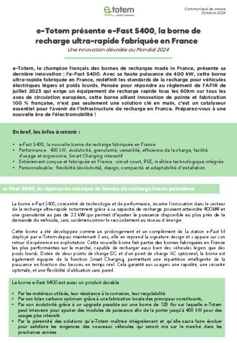 e-Totem, le champion français des bornes de recharges made in France, présente sa dernière innovation : l’e-Fast S400. Avec sa haute puissance de 400 kW, cette borne ultra-rapide fabriquée en France, redéfinit les standards de la recharge pour véhicules électriques légers et poids lourds. Pensée pour répondre au règlement de l’AFIR de juillet 2023 qui exige un équipement de recharge rapide tous les 60km sur tous les axes de circulation européen, cette borne alliant innovation de pointe et fabrication 100 % française, n’est pas seulement une solution clé en main, c’est un catalyseur essentiel pour l’avenir de l’infrastructure de recharge en France.
