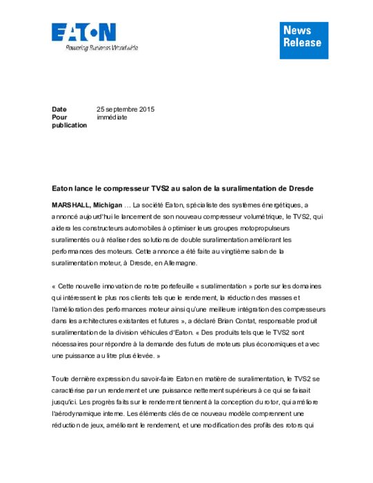 La société Eaton, spécialiste des systèmes énergétiques, a annoncé aujourd'hui le lancement de son nouveau compresseur volumétrique, le TVS2, qui aidera les constructeurs automobiles à optimiser leurs groupes motopropulseurs suralimentés ou à réaliser des solutions de double suralimentation améliorant les performances des moteurs. Cette annonce a été faite au vingtième salon de la suralimentation moteur, à Dresde, en Allemagne.