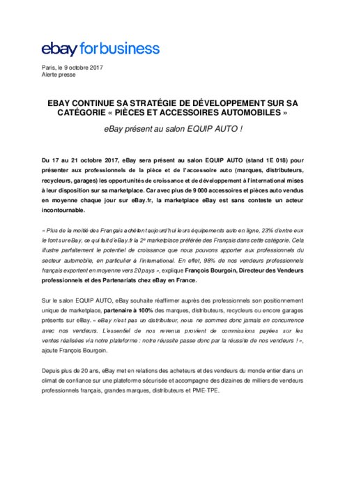 Du 17 au 21 octobre 2017, eBay sera présent au salon EQUIP AUTO (stand 1E 018) pour présenter aux professionnels de la pièce et de l’accessoire auto (marques, distributeurs, recycleurs, garages) les opportunités de croissance et de développement à l’international mises à leur disposition sur sa marketplace. Car avec plus de 9 000 accessoires et pièces auto vendus en moyenne chaque jour sur eBay.fr, la marketplace eBay est sans conteste un acteur incontournable.