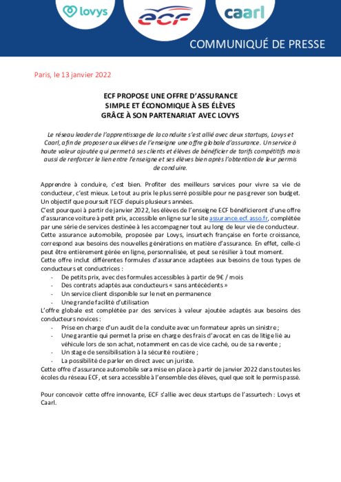 ECF, le réseau leader de l'apprentissage de la conduite, s’est allié avec deux startups, Lovys et Caarl, afin de proposer aux élèves de l’enseigne une offre globale d’assurance. Un service à haute valeur ajoutée qui permet à ses clients et élèves de bénéficier de tarifs compétitifs mais aussi de renforcer le lien entre l’enseigne et ses élèves bien après l’obtention de leur permis de conduire.