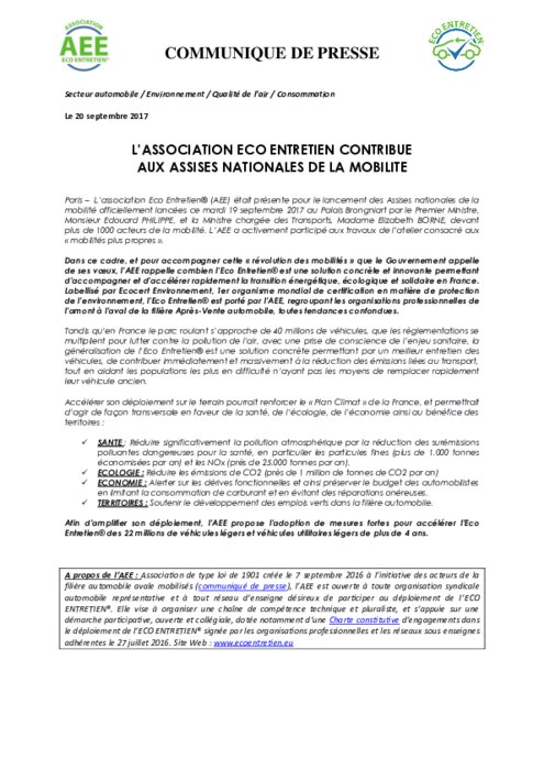 L'association Eco Entretien (AEE) était présente pour le lancement des Assises nationales de la mobilité officiellement lancées ce mardi 19 septembre 2017 au Palais Brongniart par le Premier Ministre, Monsieur Edouard PHILIPPE, et la Ministre chargée des Transports, Madame Elizabeth BORNE, devant plus de 1000 acteurs de la mobilité. L'AEE a activement participé aux travaux de l’atelier consacré aux " mobilités plus propres ".
