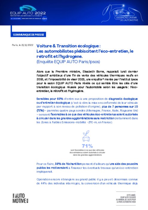Alors que la Première ministre, Elisabeth Borne, rappelait lundi dernier l’objectif ambitieux d’une fin de vente des véhicules thermiques neufs en 2035, et l’impossibilité de viser 2025, une enquête menée par l’institut Ipsos pour le salon EQUIP AUTO Paris révèle ce qui semble être les clés d’une transition écologique réussie pour l’automobile selon les usagers : l’éco entretien, le rétrofit et l’hydrogène.