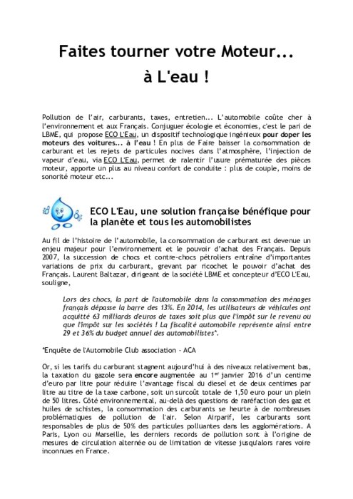 Pollution de l’air, carburants, taxes, entretien... L’automobile coûte cher à l’environnement et aux Français. Conjuguer écologie et économies, c'est le pari de LBME, qui propose ECO L'Eau, un dispositif technologique ingénieux pour doper les moteurs des voitures... à l’eau !